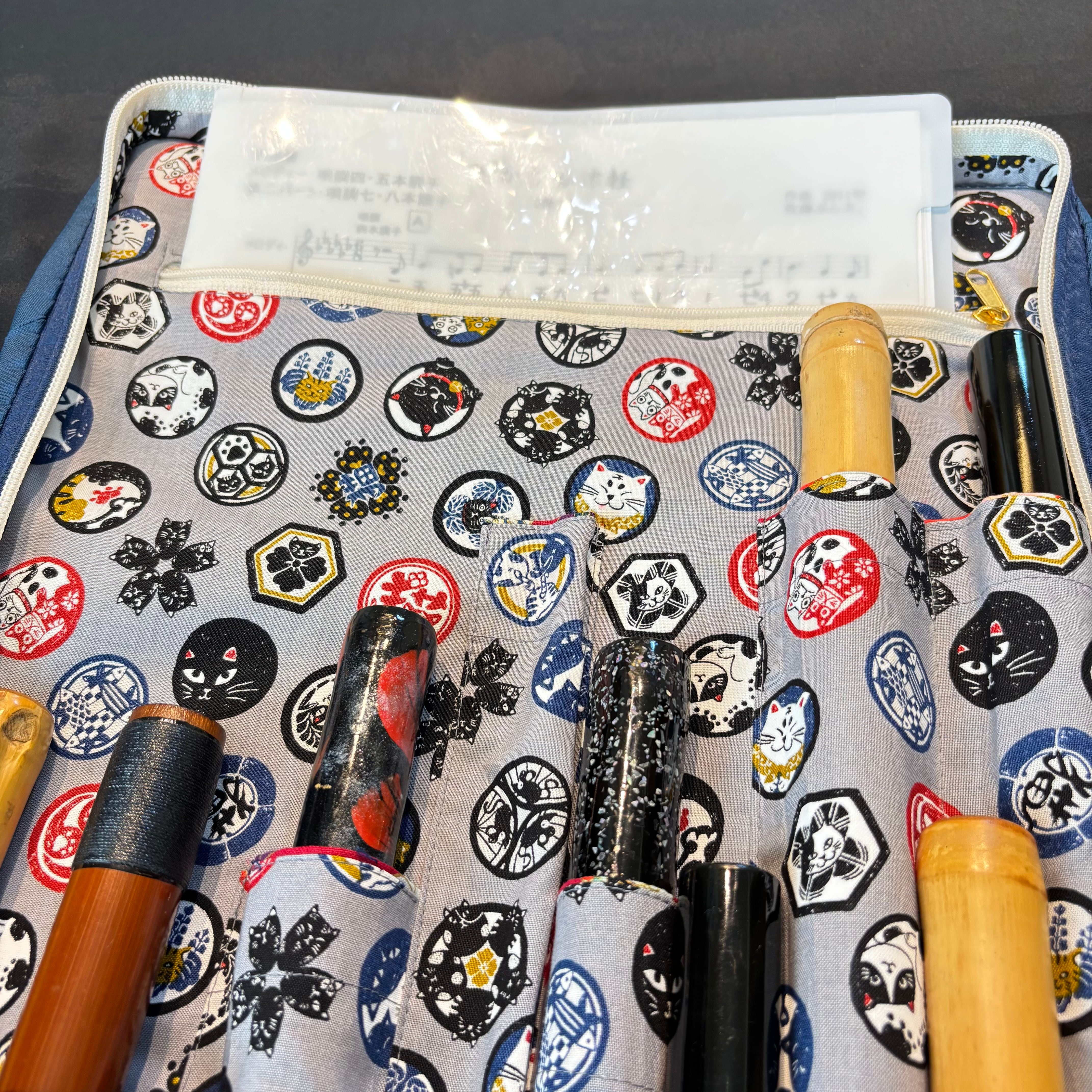 譜面も入れれる10本入れ笛袋!一点モノ♪長さ65センチまで入る笛袋