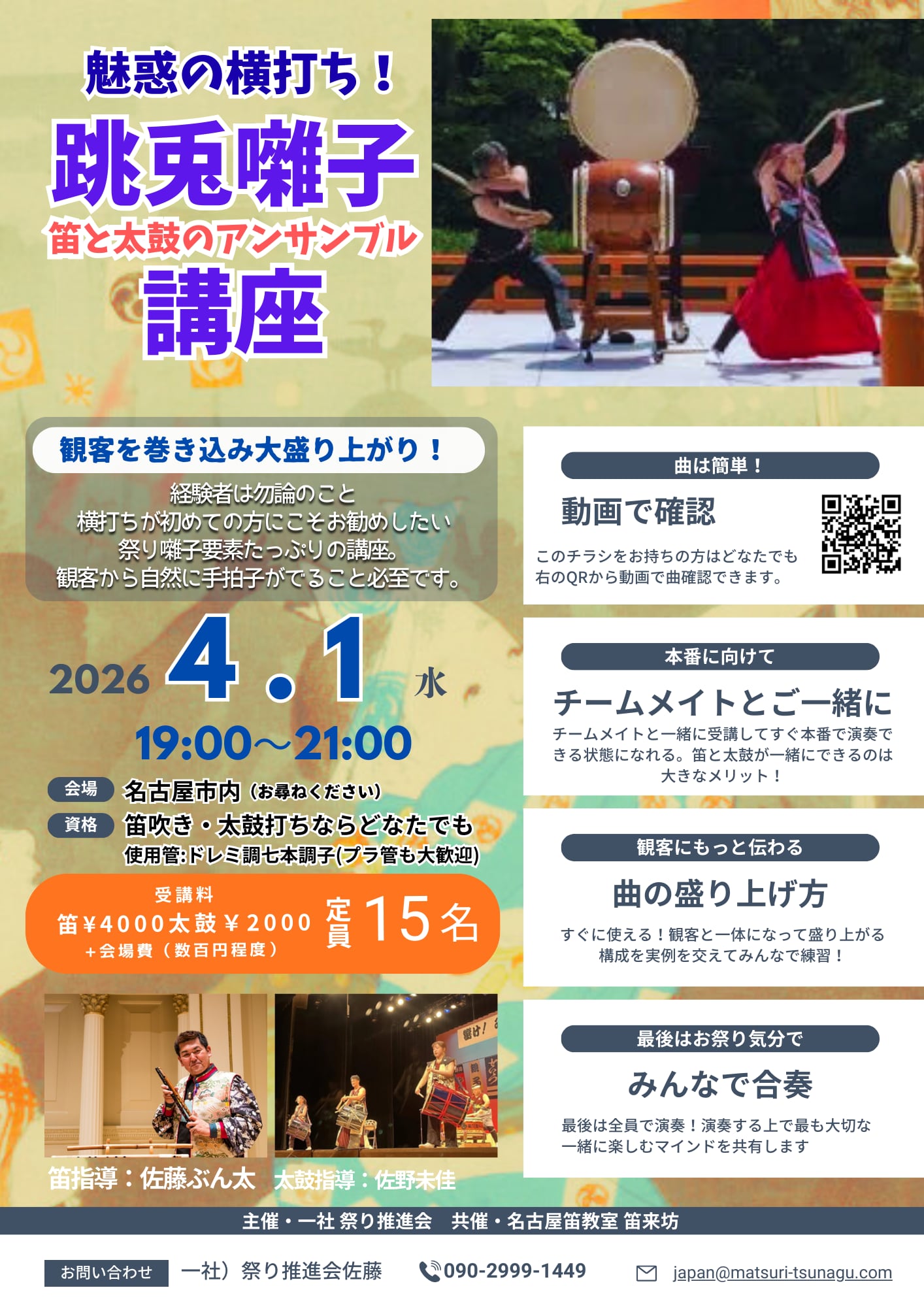受講料: 笛 ¥4,000/太鼓 ¥2,000 + 会場費(数百円程度)