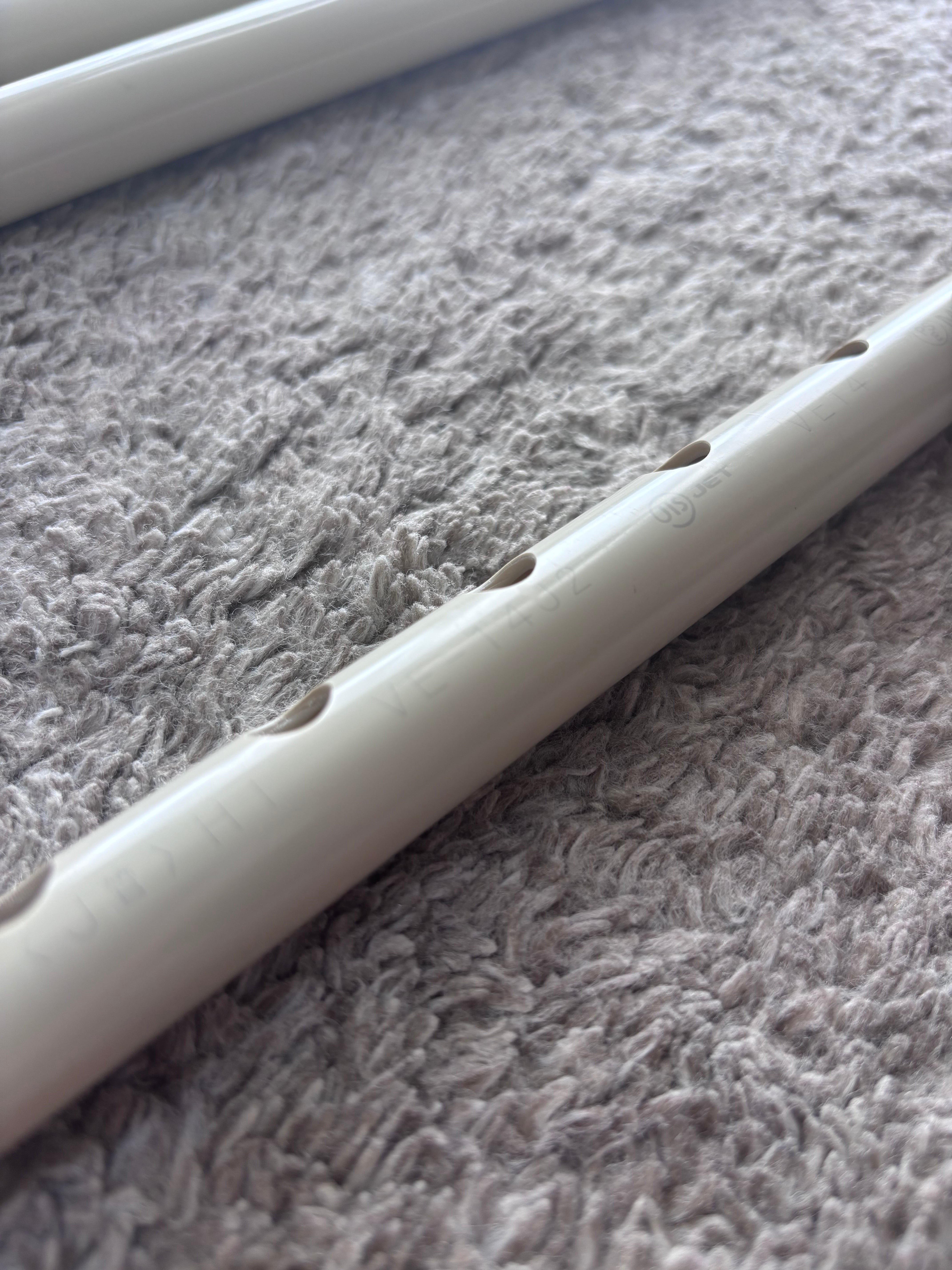 本商品は丈夫で手に入りやすい管材(VE管)を加工して製作しております。そのため、管の表面に「JIS JET」や「VE-14」といった元の管材の規格印字がうっすらと入っております。
